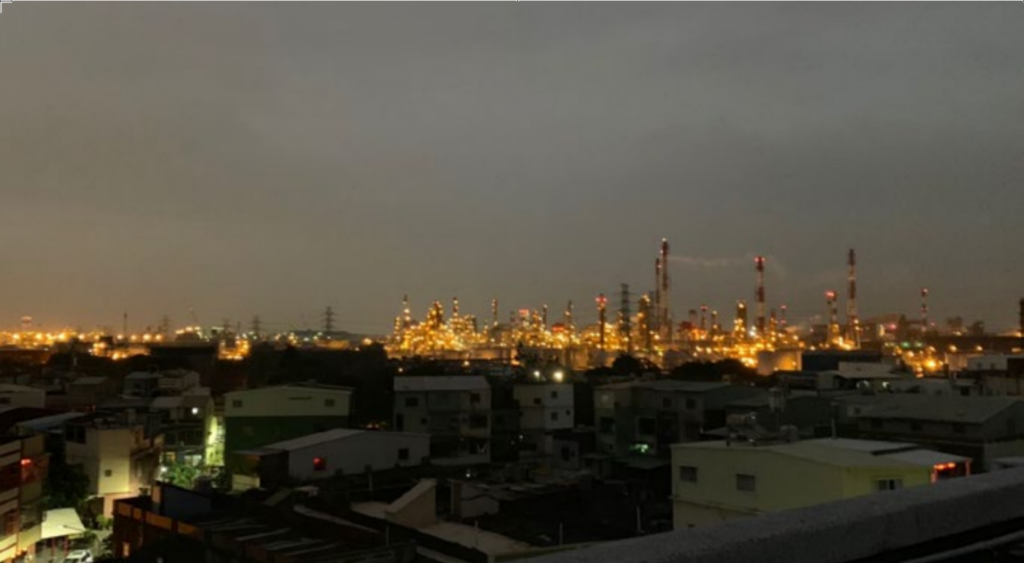 原本圍牆後就是沙灘,如今都被填海造陸,也就是所謂的南星計畫,紅毛港原本的沙灘洲際二期現在都是石油轉運槽。往陸地上看,是無數隻的煙囪,煙囪排放著白煙,工廠晚上燈火通明,雖美麗,一切卻只是表象。(黃振瑋 攝)